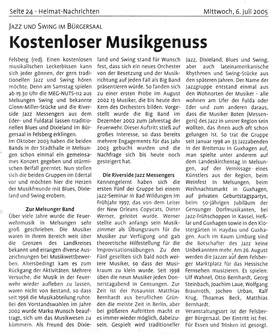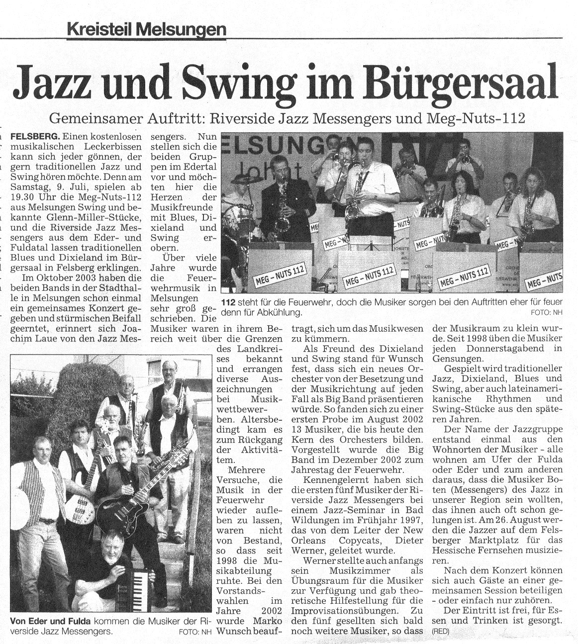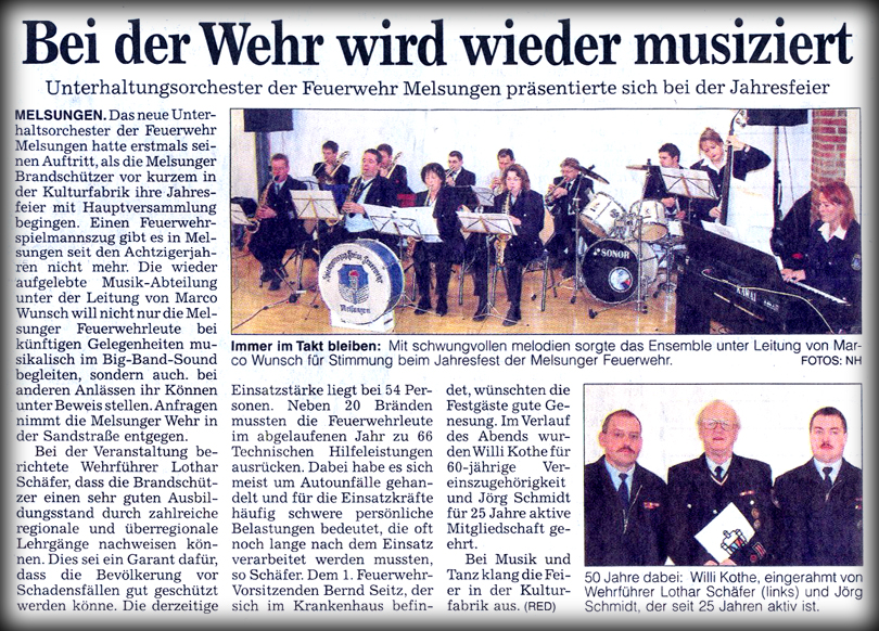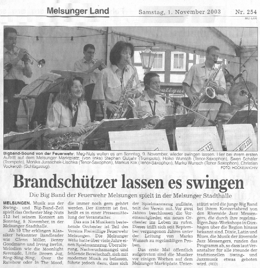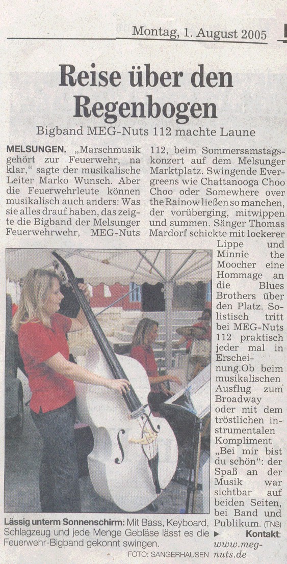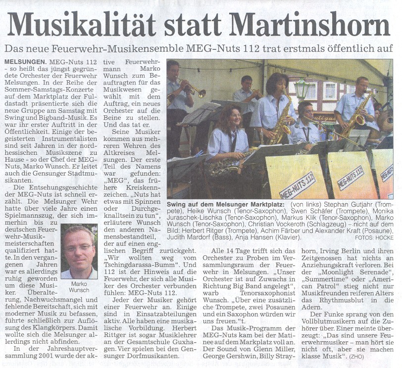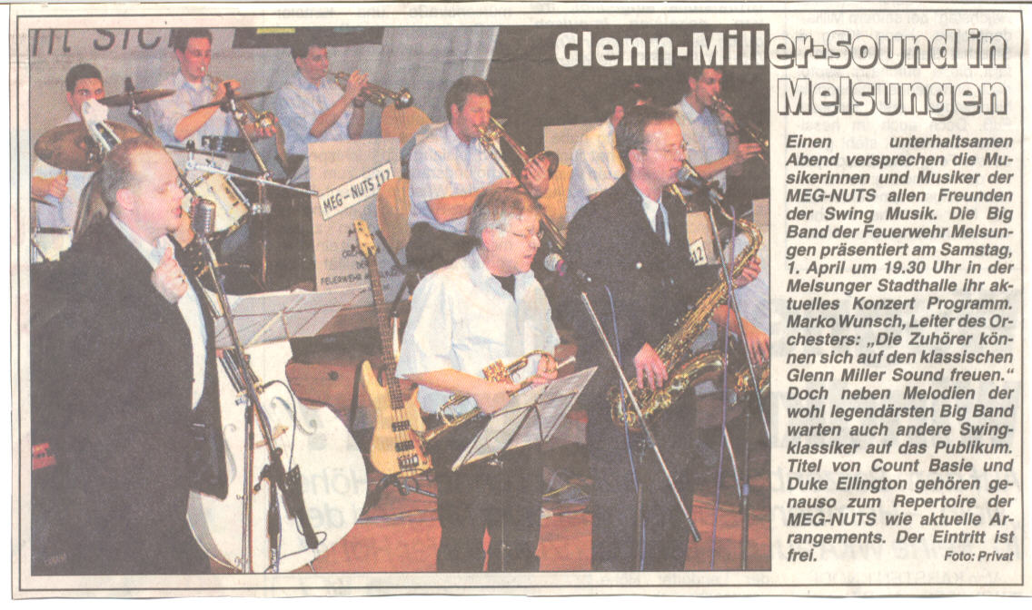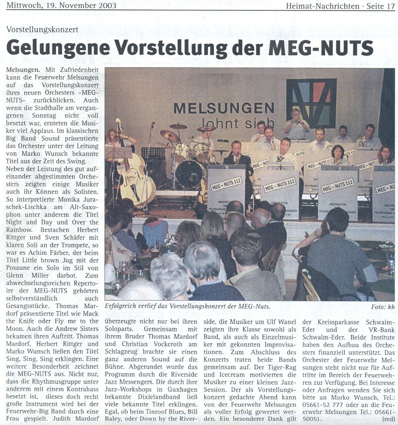 Bilder von 2002 bis 2012 29.09.2012 - Weinfahrt 05.06.2011 - Wolfershausen 29.05.2011 - Dissen 07.08.2010 - Sommer-Samstag-Konzert Melsungen 31.07.2010 - Marktplatz Homberg 30.05.2010 - Hessentag Stadtallendorf 27.09.2009 - Industriepark-Kassel 06.09.2009 - Helmarshausen 17.05.2009 - Festzug Melsungen 24.01.2009 - Jazz Workshop Guxhagen 22.06.2008 - Stadtfest Gudensberg 07.06.2008 - Hessentag Homberg 26.08.2007 - Landesfeuerwehrtag Rotenburg 03.06.2007 - Klostermarkt Morschen 21.03.2007 - Bericht HNA 27.01.2007 - MEG-NUTS bei Jam Session in Guxhagen 12.08.2006 - Sommer-Samstag-Konzert Melsungen 16.07.2006 - Schlosspark Melsungen 07.07.2006 - 09.07.2006 - Fahrt nach Frauenstein in Sachsen 29.06.2006 - Probe im Bach-Land-Hof 26.06.2006 - Heimatfest Melsungen 01.04.2006 - Konzert Stadthalle Melsungen 19.11.2005 - Konzert in Reinhardshausen 03.09.2005 - Wolfershausen 30.07.2005 - Sommer-Samstag-Konzert Melsungen 09.07.2005 - Konzert in Bürgersaal Felsberg 05.06.2005 - MEG-NUTS auf Baunataler Stadtfest 08.05.2005 - MEG-NUTS in Reinhardhausen 23.04.2005 - MEG-NUTS auf Witzenhäuser-Woche 09.11.2003 - MEG-NUTS Konzert in der Stadthalle Melsungen 26.07.2003 - MEG-NUTS bei Melsunger Sommersamstags-Konzert 15.06.2003 - MEG-NUTS bei Feuerwehrfest in Harle 28.03.2003 - MEG-NUTS bei Jam Session in Guxhagen 23.11.2002 - Erster Auftritt mit dem Orchester der Feuerwehr Melsungen